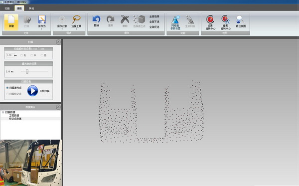 以全局?jǐn)z影測量系統(tǒng)獲得的標(biāo)記點(diǎn)數(shù)據(jù)為整體基準(zhǔn),輻射到個別掃描區(qū)域,掃描汽車整車以及部分拆解后的零件,獲取其三維數(shù)據(jù)。